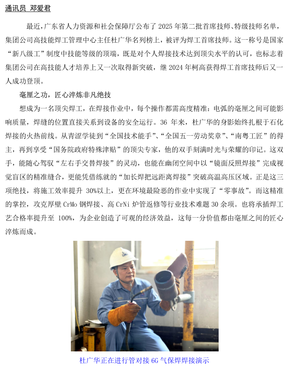 杜廣華被評(píng)為焊工首席技師 晉升國(guó)家“新八級(jí)工”制度中技能等級(jí)頂端